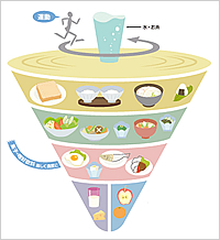 “餐飲平衡表”是2005年6月日本厚生勞動(dòng)。ㄈ毡菊t(yī)療、勞動(dòng)部門(mén))與農(nóng)林水產(chǎn)省一起針對(duì)飲食生活標(biāo)準(zhǔn)采取的具體活動(dòng)之一!安惋嬈胶獗怼敝蟹譃橹魇、主菜、配菜,按照相應(yīng)的比例體現(xiàn)在圖表中。讓人們可以清楚的看到“吃什么”“吃多少”。